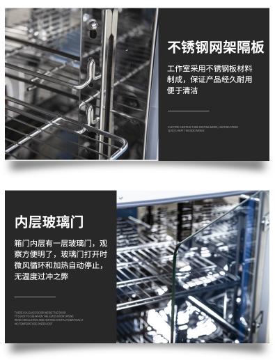 ● 箱門(mén)內(nèi)層有(yǒu)一(yī)層玻璃門(mén),觀察方便明(míng)了(le),玻璃門(mén)打開(kāi)時(shí₽),微(wēi)風(fēng)循環和(hé)加熱(rè)自(zì)動停止,無溫度過沖之弊。